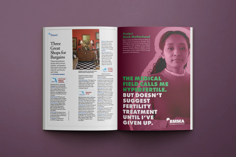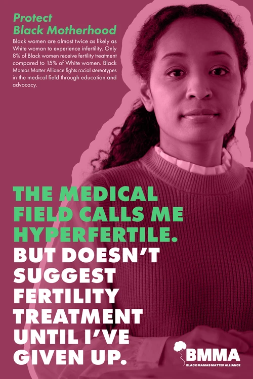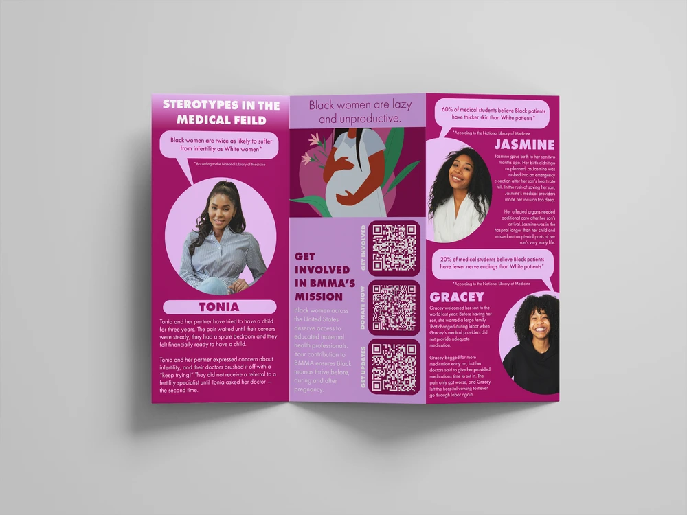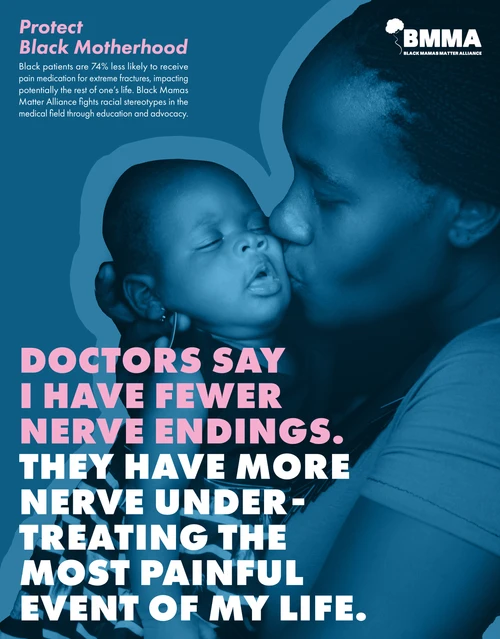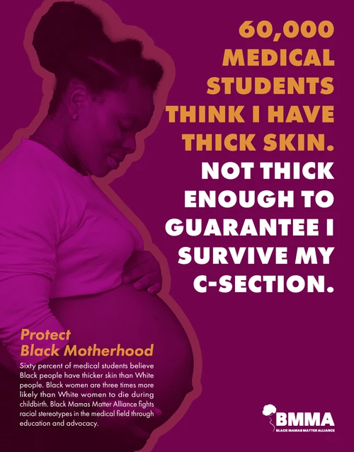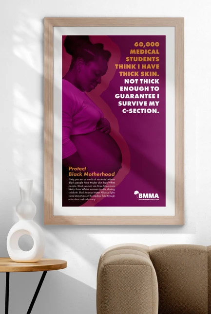 Our “Protect Black Motherhood” campaign for Black Mamas Matter Alliance (BMMA) aims to raise awareness and challenge harmful stereotypes in the medical field that contribute to alarming disparities in Black maternal health. In alignment with BMMA’s mission to advocate, drive research, build power, and shift culture for Black maternal health, rights, and justice, we focused on addressing prevalent misinformation still taught in medical education. I collaborated closely with a copywriter to develop impactful messaging, including a powerful poster featuring the statement, “60,000 medical students think I have thick skin. Not thick enough to guarantee I survive my c-section,” which confronts the dangerous misconception that Black women can tolerate more pain, underscoring the life-threatening consequences of such biases.